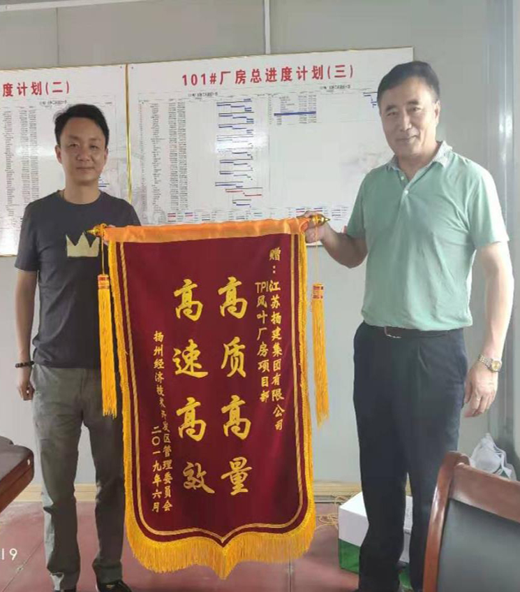 TPI風機葉片生產廠房建設工程是開發區管委會2018年度重大招商引資項目,總建設規模達到87409平方米,合同工期僅有200天。在巨大的工期壓力面前,項目部全體管理人員充分發揮揚建人“艱苦卓絕、不怕吃苦”的精神,克服重重困難,在約定工期內,保質保量的完成全部工作內容,交付廠方完成調試且順利投產,得到開發區管委會領導的高度肯定并向項目部贈送了“高質高量 高速高效”錦旗和“杰出貢獻獎”的獎杯。