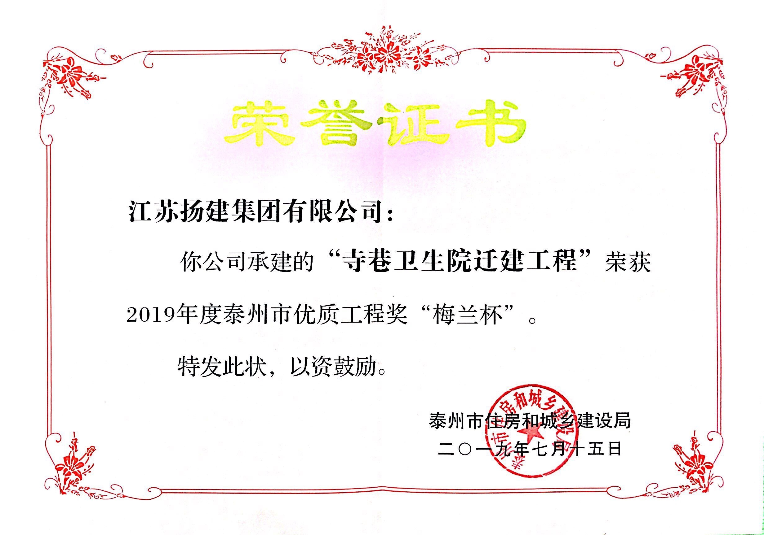 揚建網訊 泰州市住房和城鄉建設局近日公布了2019年度泰州市優質工程獎“梅蘭杯”獲獎項目名單。我集團承建、華發公司參建的寺巷衛生院遷建工程榮獲泰州市“梅蘭杯”優質工程獎。