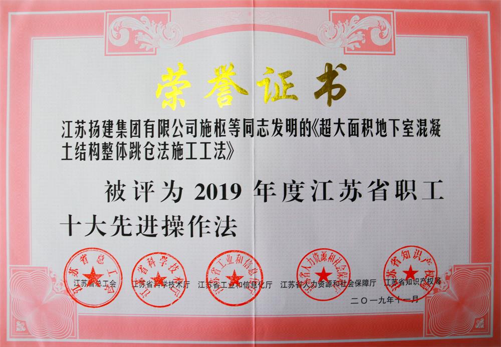 揚(yáng)建網(wǎng)訊 五一前夕,江蘇省職工十大科技創(chuàng)新成果、十大先進(jìn)操作法、十大發(fā)明專利評(píng)審委員會(huì)對(duì)2019年度江蘇省職工十大科技創(chuàng)新成果、十大先進(jìn)操作法、十大發(fā)明專利評(píng)選結(jié)果進(jìn)行公示、表彰。我集團(tuán)項(xiàng)目管理一公司施樞等同志發(fā)明的“超大面積地下室混凝土結(jié)構(gòu)整體跳倉法施工工法”榮獲2019年度江蘇省職工“十大先進(jìn)操作法”。