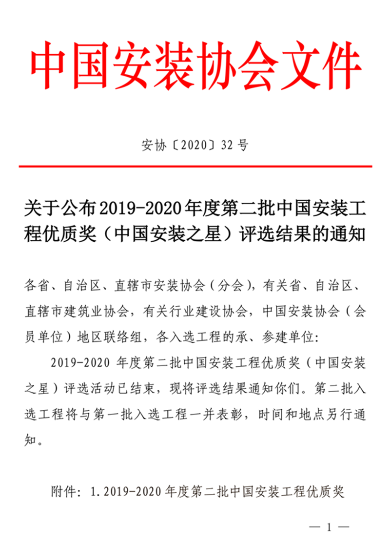 揚建網(wǎng)訊 日前,中國安裝協(xié)會公布了2019-2020年度第二批中國安裝工程優(yōu)質(zhì)獎(中國安裝之星)評選結(jié)果,由集團機電分公司和環(huán)保公司共同申報的“江廣智慧城F地塊項目、K地塊項目工程施工(F地塊項目)安裝工程”和“TPI風機葉片生產(chǎn)廠房建設(shè)工程安裝工程”榮獲年度“中國安裝之星”稱號,這也是繼安裝產(chǎn)業(yè)板塊參建的新建萬福大橋工程和揚州中學教育集團樹人學校高中部榮獲“國家優(yōu)質(zhì)工程獎”后,再一次捧回“國字號”質(zhì)量獎項。