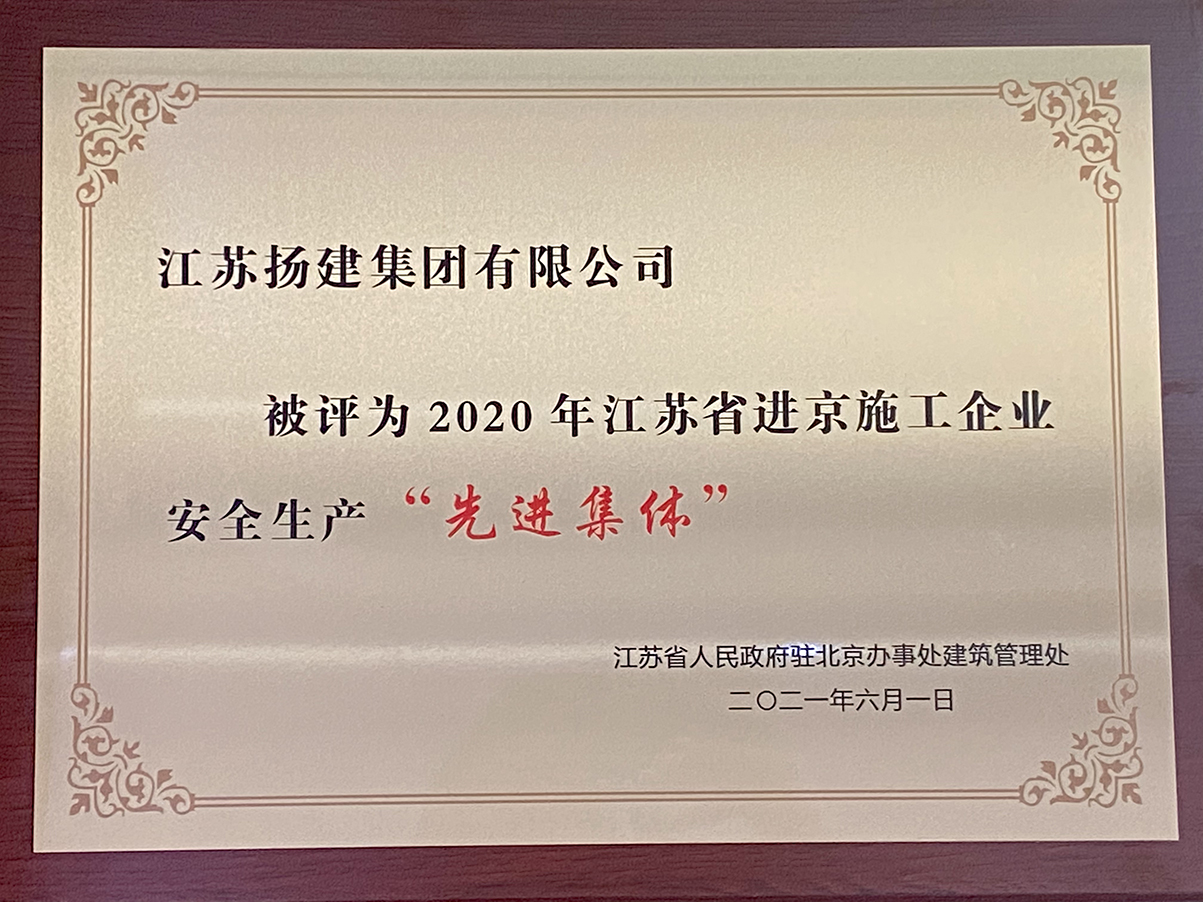 揚(yáng)建網(wǎng)訊 6月9日,江蘇省人民政府駐北京辦事處建筑管理處授予江蘇揚(yáng)建集團(tuán)有限公司2020年江蘇省進(jìn)京施工企業(yè)安全生產(chǎn)“先進(jìn)集體”稱號。