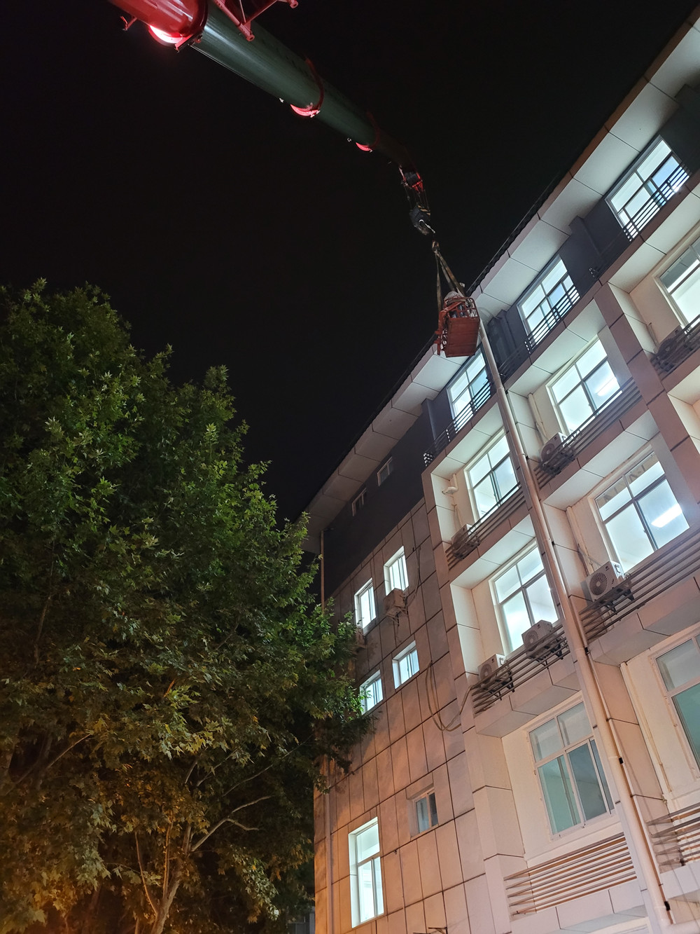 ——凌晨2點(diǎn),隨著時間的推移,為確保任務(wù)的完成,現(xiàn)場坐陣的卞總緊急增加了一臺25T的汽車吊車,大大加快了外墻排風(fēng)管道的安裝進(jìn)度;