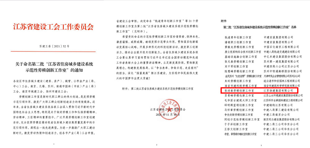 揚建網訊 11月10日,從江蘇省建設工會工作委員會傳來喜訊,我集團公司“張迎春勞模創新工作室”榮獲省住房城鄉建設系統示范性勞模創新工作室稱號。