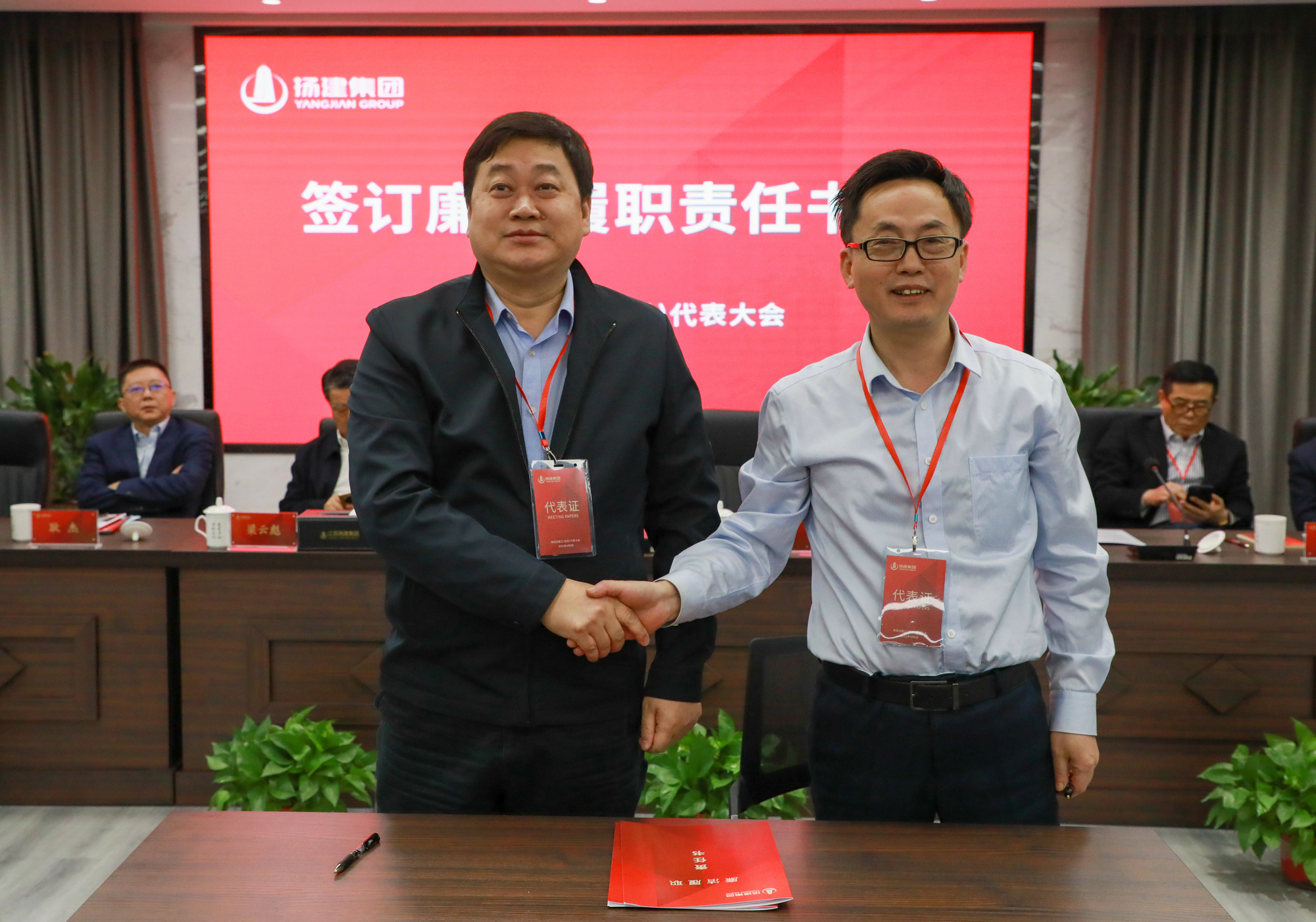 會上,一公司、三公司、鋼結構、華晟作為代表,登臺領取了集團公司總經理下達的年度《經營管理目標責任書》,并簽訂了年度《安全生產目標責任書》; 二公司、樁基、建祥、市政作為代表,與集團黨委書記簽署了年度《廉潔履職責任書》。