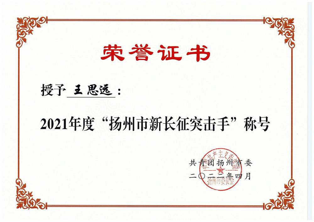 揚建網訊 近日,團市委表彰了一批先進集團和優秀個人,揚建集團王思遠同志榮獲2021年度揚州市“新長征突擊手”稱號。