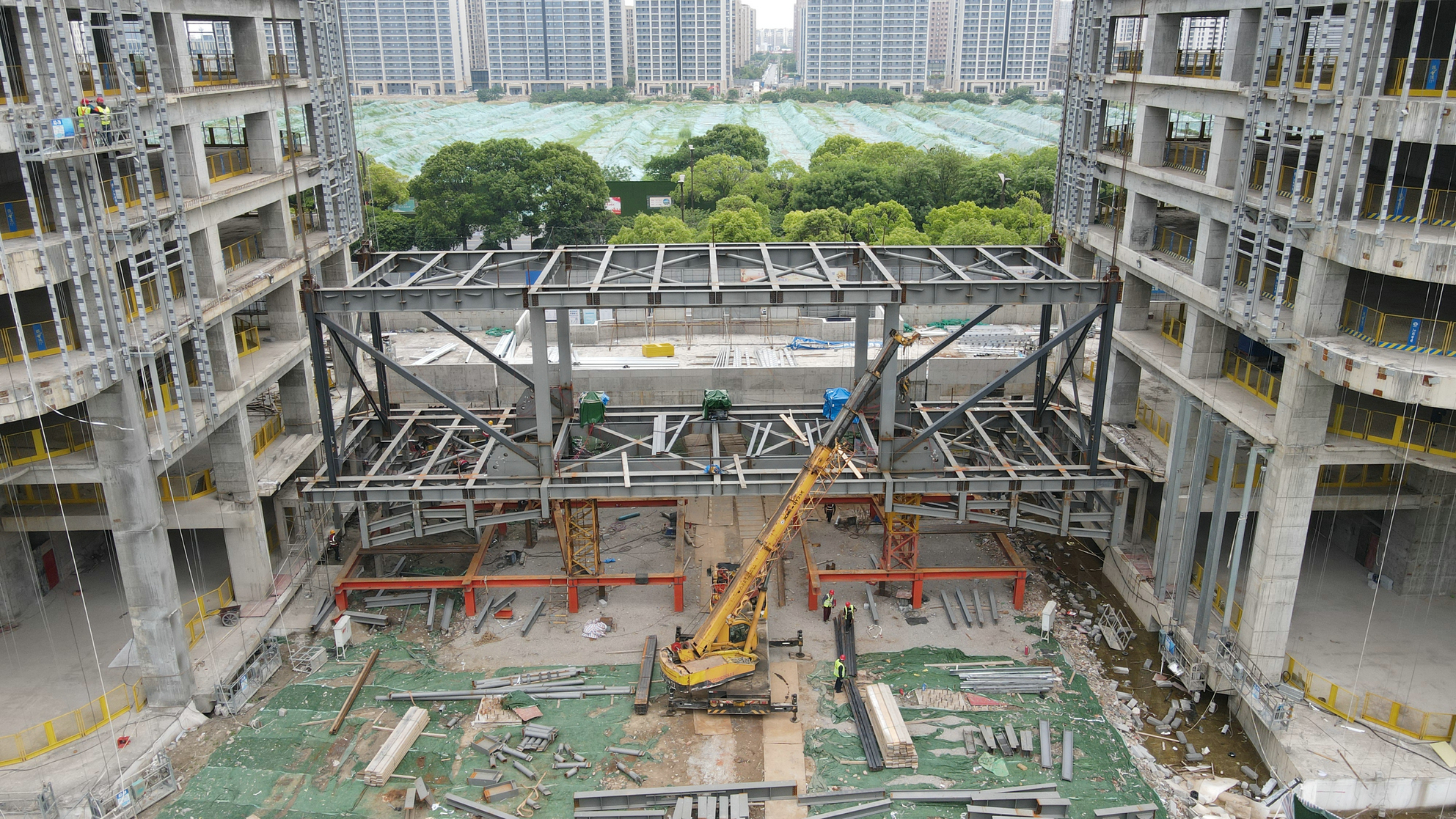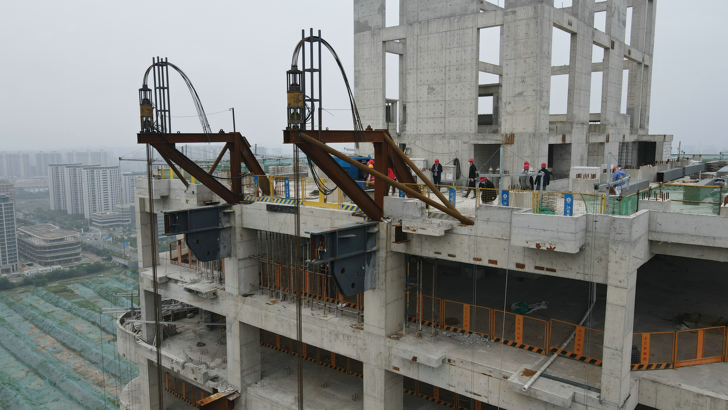 建工科技園鋼結構連廊預提升順利完成