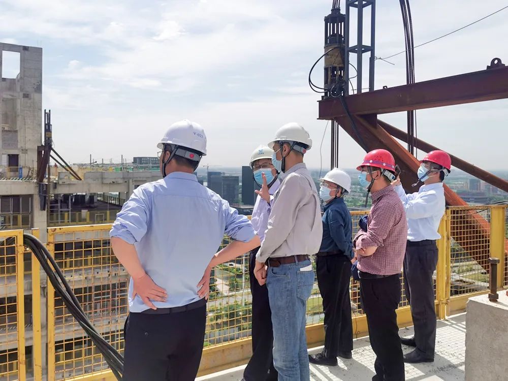 為確保鋼連廊的順利提升,施工期間,集團領(lǐng)導(dǎo)和技術(shù)部門多次來現(xiàn)場進行工作指導(dǎo),邀請了東南大學(xué)郭正興教授來項目對鋼連廊提升的準(zhǔn)備工作進行檢查和驗收。