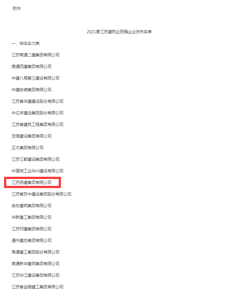 揚(yáng)建網(wǎng)訊 近日,江蘇省住房城鄉(xiāng)建設(shè)廳、統(tǒng)計(jì)局、商務(wù)廳聯(lián)合發(fā)布 “2021年度江蘇省建筑業(yè)百?gòu)?qiáng)企業(yè)”榜單,江蘇揚(yáng)建集團(tuán)有限公司位列綜合實(shí)力類(lèi)第12名。