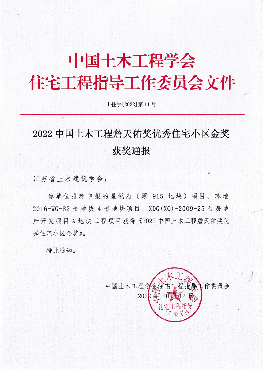 揚建網訊 近日,中國土木工程學會住宅工程指導工作委員會揭曉了“2022年中國土木工程詹天佑獎優秀住宅小區金獎入選工程”名單,集團公司承建的星悅府(原915地塊)住宅項目在眾多項目中突出重圍,斬獲金獎。