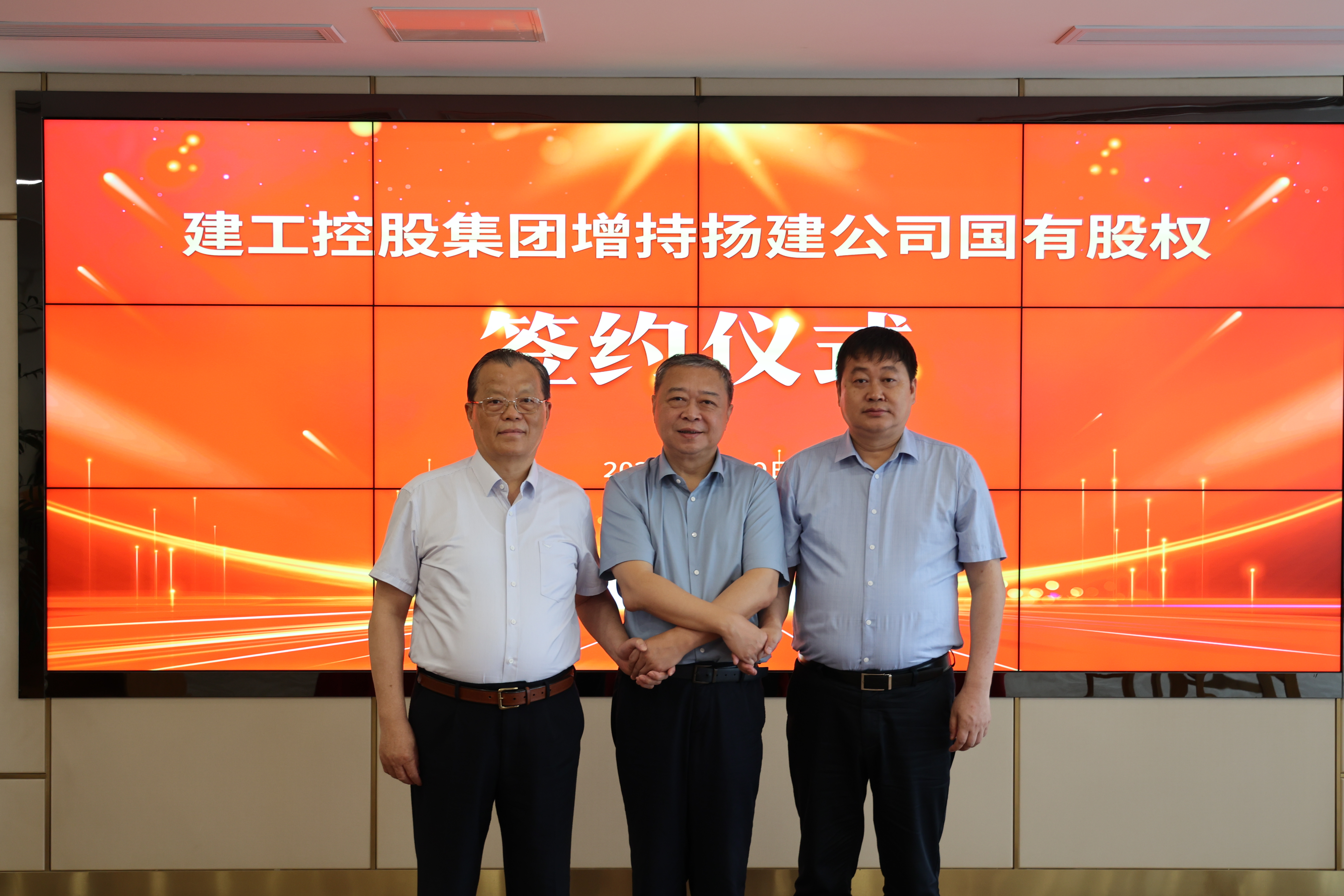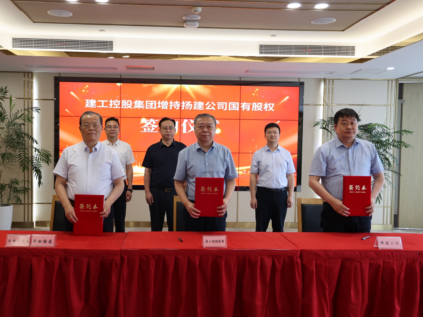 在市國資委授權代表的見證下,王宏、康往東、曹德榮分別代表建工控股集團、揚建公司、華融公司及自然人股東,正式簽署《增資擴股協議書》。本次增持完成以后,江蘇揚建集團有限公司注冊資本金將從5億元增加至7億元,其中揚州建工控股集團有限公司持股比例42.86%為第一大股東,揚建重新成為國有控股企業。