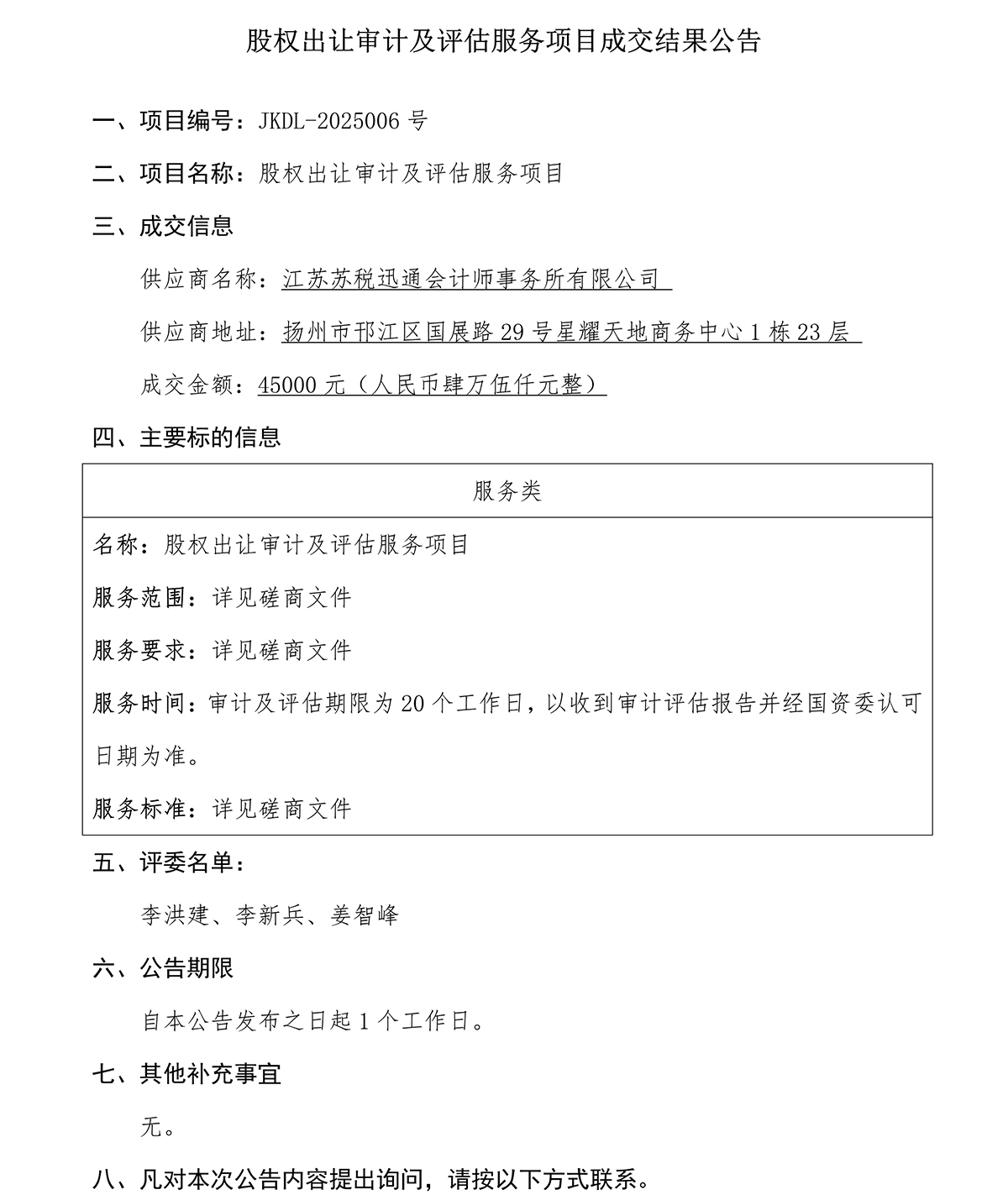 股權出讓審計及評估服務項目成交結果公告